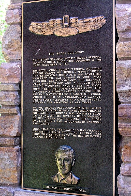 Bugsy Siegel was a legendary gangster that was a driving force in the development of the Las Vegas Strip. Siegel opened the first luxury hotel on the strip in 1946, The Flamingo Hotel & Casino. Only a year after opening the hotel, Siegel was murdered while at the Beverly Hills home of his girlfriend, Virginia Hill. He was sitting on the couch reading the Los Angeles Times. To this day, the crime remains unsolved. Siegel's bronze memorial can be found outside the wedding chapel at the Flamingo Las Vegas and the ghost of the gangster has reportedly been seen wandering around the area in his smoking jacket.